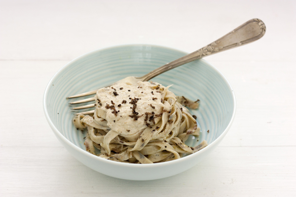 La pasta la he preparado con setas deshidratadas y harina de trompetas de la muerte, que tenía por casa de otras recetas. La salsa a base de nueces, le he añadido trufa negra rallada para darle el puntito de acompañamiento a la pasta de setas.