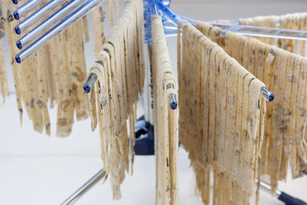 Pasado el tiempo de reposo, laminamos la pasta y la cortamos, como vimos aquí. Una vez cortada, la dejamos secar colgada, mientras preparamos la salsa, y el agua de cocción se calienta.