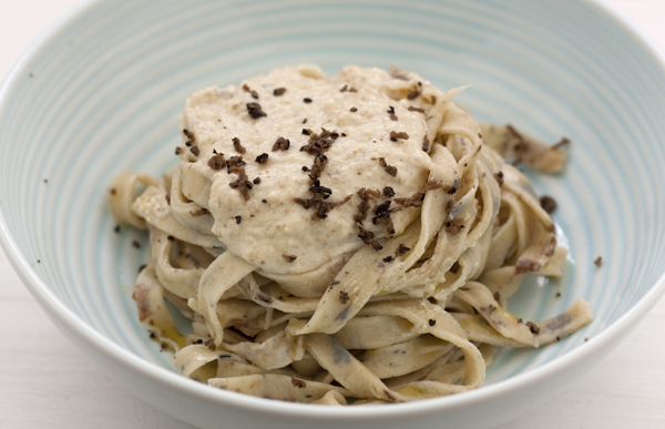 Mientras la pasta se seca ligeramente, y el agua busca el hervor, preparamos la salsa de nueces y trufa: