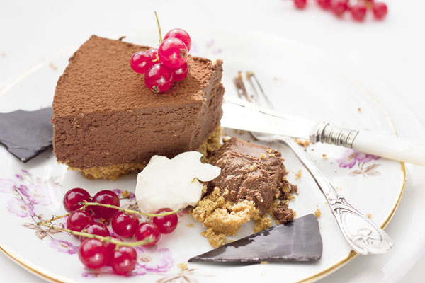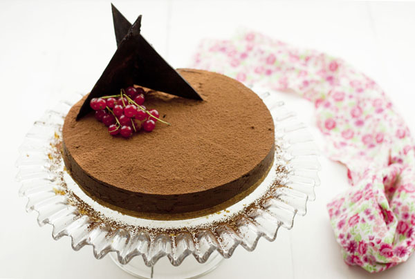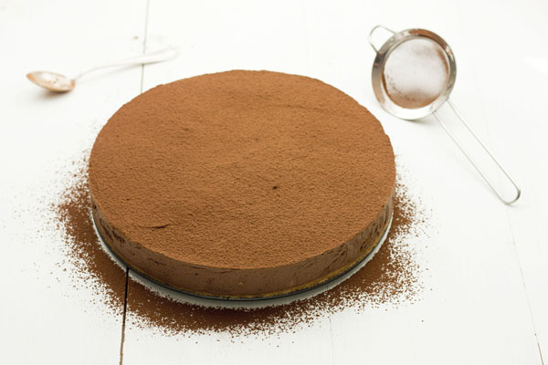 Espolvoreamos cacao amargo sobre la tapa y decoramos con las figuras de chocolate negro.