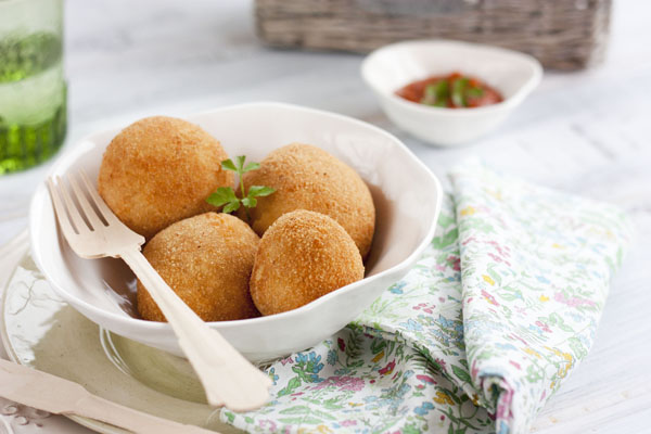 Los arancini son unas croquetas redondas grandecitas, de entre 8-10 cm, hechas de pasta de arroz cocido para risotto, ligado luego con huevo y queso rallado, que se rellenan y se fríen. Se trata de un plato típico de la cocina siciliana y se toma como aperitivo.