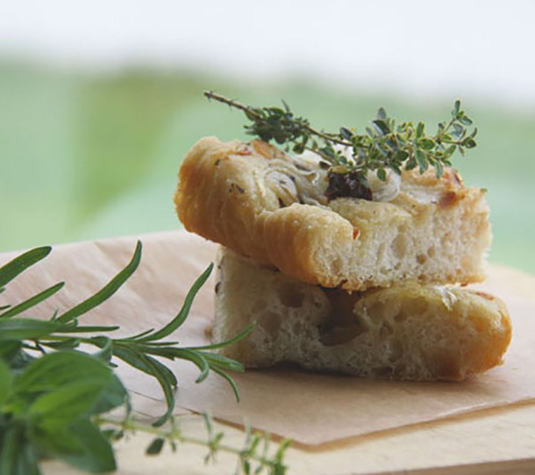 FOCACCIA DE CEBOLLA Y TOMATES SECOS CON ACEITE DE HIERBAS