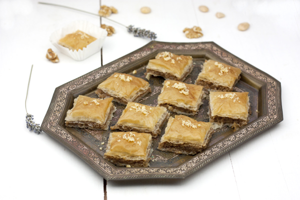 El Baklava es un dulce originario de la zona mediterránea oriental y Oriente próximo, que hoy en día, se realiza a base de láminas de pasta philo y un relleno de nueces o frutos secos triturados con azúcar y alguna especie. Una vez horneado se riega con un delicioso jarabe o sirope de miel generalmente aromatizado. Y añado, es un dulce absolutamente delicioso. Uno de mis favoritos, y mira que no soy especialmente dulcera, pero es que los dulces preparados con miel, tienen un “no se que”, que a pesar de ser dulces, son fascinantes y para mi gusto, a pesar de llevar miel, nada empalagosos, o al menos nada empalagosos al estilo de los que llevan azúcar.
