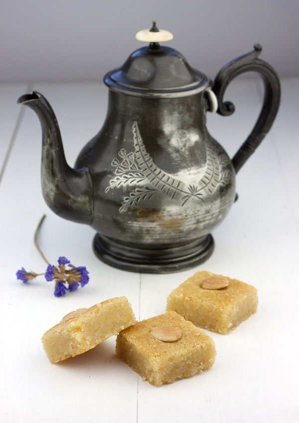 Como suele ser habitual en estos dulces árabes, se presenta en pequeñas porciones, así que antes de introducirlo en el horno se cortan los cuadraditos, porque es una masa muy densa, aunque blanda, y se decora cada porción con una almendra. Eso si, la masa así preparada, se deja reposar media hora, para que la sémola absorba el líquido. Una vez reposada, al horno y listo. En caliente y recién salido del horno se riega con el almíbar frío y se deja empapar, como si de una tarta capuchina se tratase. Los que no seais muy dulceros, no temais, aunque lleve el almibar, el dulzor no es lo que predomina en este delicioso bocado.