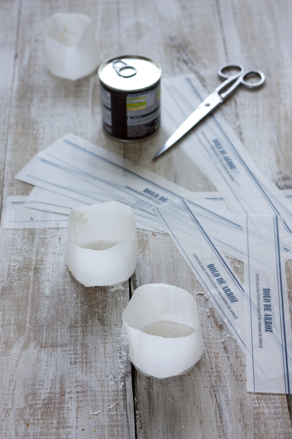 Comenzamos preparando las cápsulas o moldes con papel de horno, una lata pequeña y algo de engrudo, como nos enseña Ile en su tutorial. Podéis también cocinar los bolos en otro tipo de moldes, como los de muffins, pero es que yo soy un poco pijotera, y si preparo unos bolos de arroz, quiero que parezcan bolos, y no magdalenas. Me da la sensación que hasta saben mejor.
