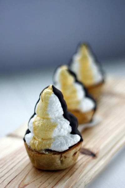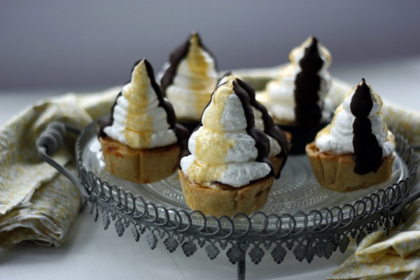 Sacamos los pastelitos del horno y con ayuda de una cucharilla desde arriba del pastel, hacemos 2 tiras de yema y 2 tiras de chocolate fundido, alternando una y otra como en las fotografías.