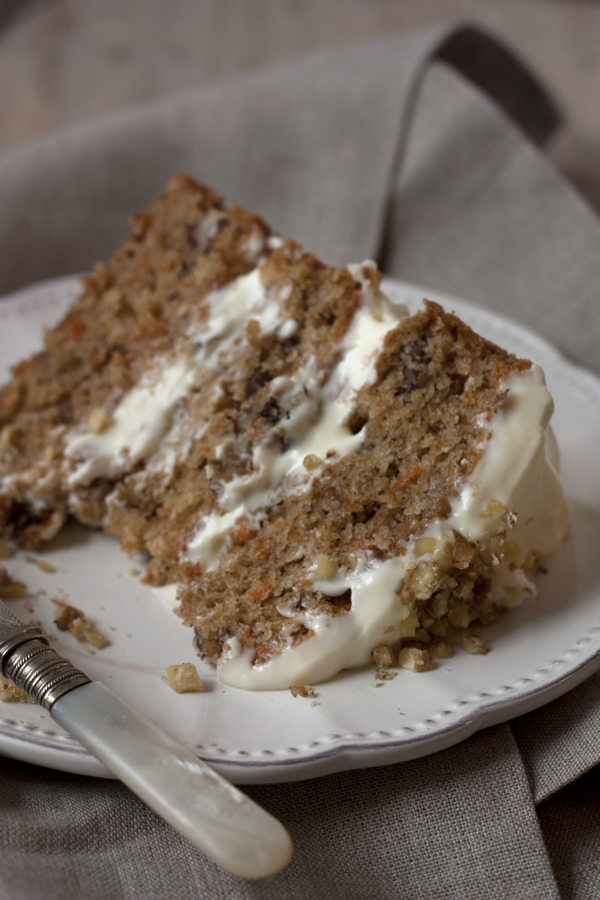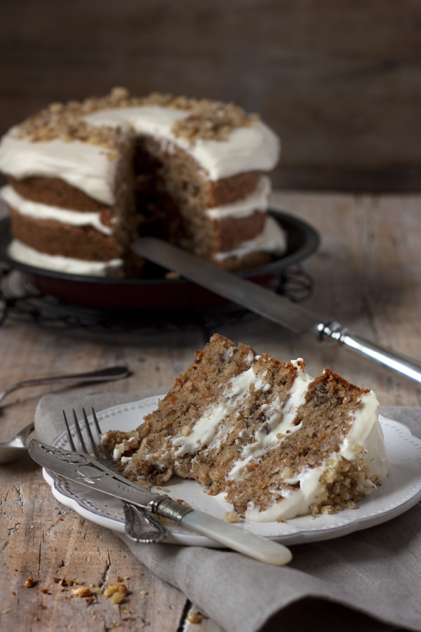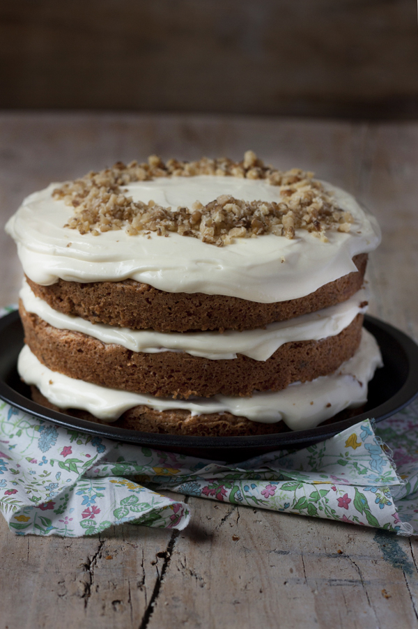 Veo que te estás aficionando a los “layer cakes”. No me extraña, porque son tan vistosos … Y eso que este pastel de zanahorias es de lo más sencillo, pero siempre son imponentes.