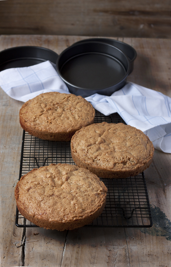 Repartimos la mezcla parejamente en los tres moldes. Los golpeamos contra la superficie para extraer el aire y al horno durante 25 minutos. Pasado ese tiempo, bajamos al temperatura del horno 150ºC y dejamos otros 10-12 minutos. Para los de 23 cm con 45 minutos a 180ºC será suficiente. En cualquier caso estarán listos si al introducir la punta de una brocheta, sale limpia.