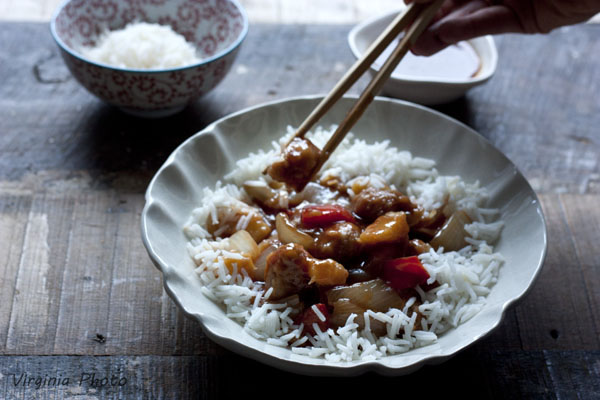 Servimos con arroz basmati cocido y un bowl con la salsa de agridulce para quien quiera mas.