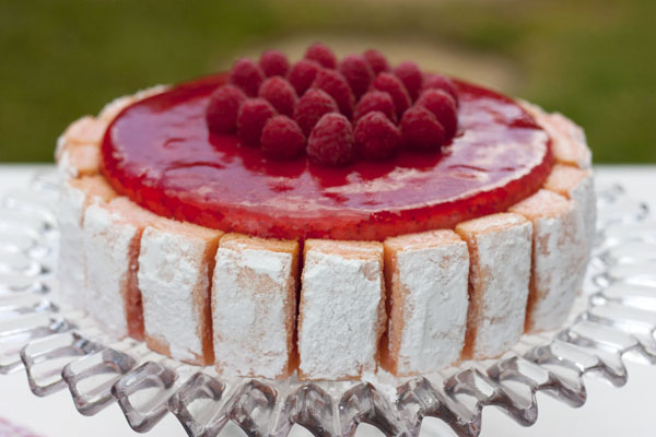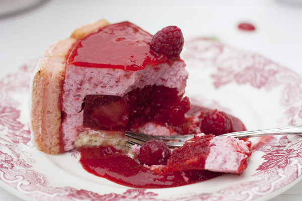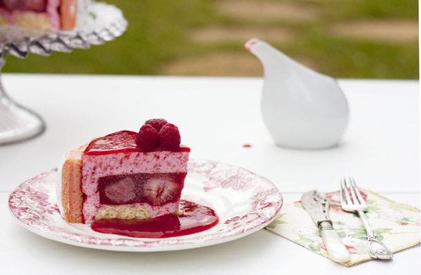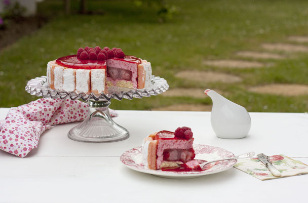 Se trata de una charlota de fresas y frambuesas, tapizada por biscuits rosas de Reims y guardando en su interior una gelatina de fresas y una mousse de frambuesas, todo ello sobre unos bizcochos de soletillas remojados en almíbar aromatizado con licor y cubierto por una gelatina de fresas. Como veis, un postre de 10.