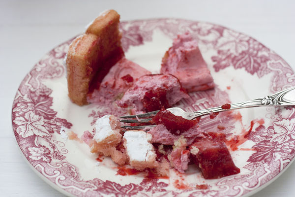 Servimos acompañada de una cama de salsa de fresas tibia que nos ha sobrado de napar la charlota, o de un coulis de tibio de frutos rojos. El bocado frío y espumoso de la charlota en contraste con la salsa tibia es una delicia.