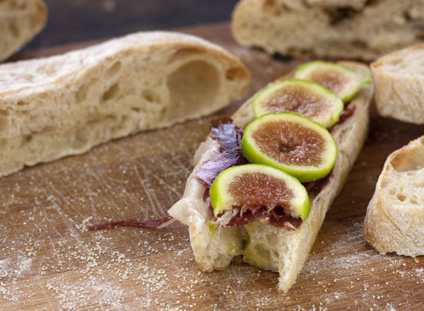 Hacemos rebanadas que regamos con aceite de oliva virgen, ponemos una loncha de jamón ibérico y una fila de higos frescos, o lo que mas nos apetezca. A disfrutar.