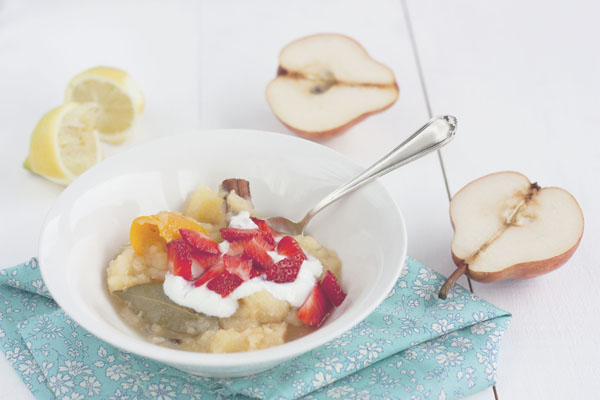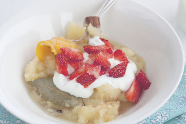 Pero si esto es nuestra merienda de tantas tardes con la peque… variando las fresas con frambuesas o arándanos congelados por ejemplo y con muchas especias para calentarnos y luchar contra el frío… Eso si, nunca lo he probado con laurel pero antes del fin de semana ya lo habremos probado :o)