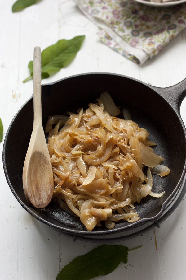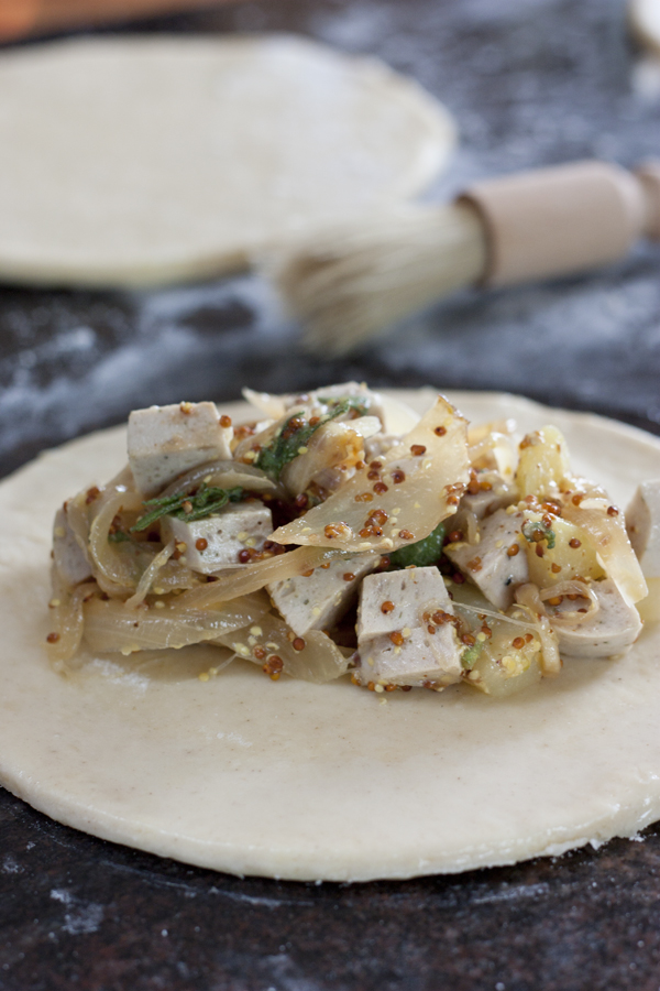 El relleno sencillo, salchichas alemanas “Bratwurst” troceadas, cebolla pochada para dar jugosidad al relleno y patata cocida, todo ello aderezado con unas hojas de salvia fresca y unas cucharadas de mostaza. Ojo no sustituir la salvia por salvia seca, pues en esta hierba el sabor cambia bastante. Si no encontraseis salvia fresca sustituirla simplemente por perejil.
