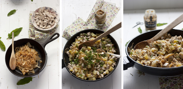 Retiramos del fuego y añadimos las patatas troceadas, la salvia y la mostaza. Reservamos.