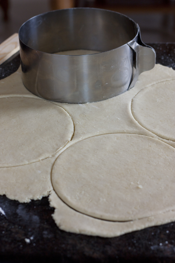 Sacamos del frío y estiramos la masa sobre una superficie enharinada de un grosor como de unos 0,5 cm. Cortamos círculos de unos 16 cm de diámetro.