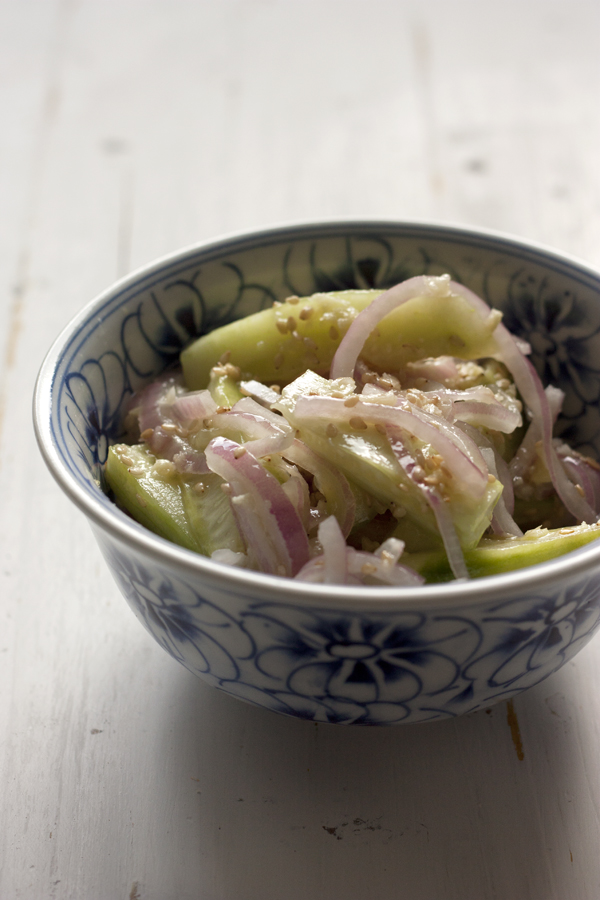 La acompañamos con una ensalada de pepino y cebolla roja con sésamo y jengibre, absolutamente refrescante, que nos propone Yotam Ottolenghi en su libro “Plenty”, y que resulta ideal para días de calor.