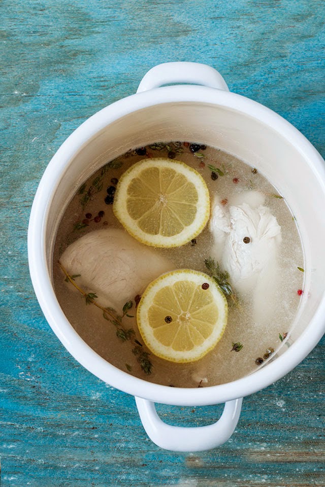 Pues bien esta ensalada la acompañamos además de con burrata, con unas pechugas de pollo cocinadas durante unos minutos en una mezcla de caldo, limón y tomillo. Quedan con un sabor delicioso y de lo mas jugosas.