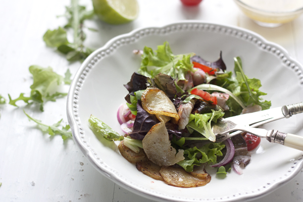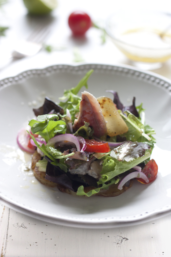 Con esta ensalada, podemos además tener preparados los ingredientes con antelación, las patatas cocidas en la nevera, y el salmonete o el pescado que queramos ya marinado, siendo solo necesario, rustir las patatas y montar la ensalada. Se le puede pedir mas a este plato. Siiii, que esté rico y eso lo cumple con creces.