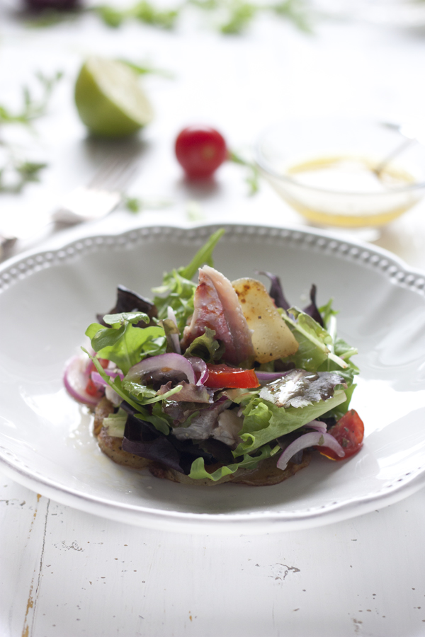 En este caso he preparado una ensalada de lo mas completita, tiene verdura, hidrato de carbono en forma de patatas y proteína, con el salmonete que incorporamos marinado, recordando un poco a un ceviche. Resulta un plato único ideal para esos día de calor en que no apetece demasiado comer dos platos.