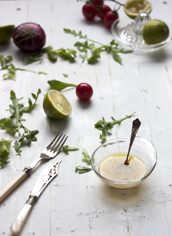 Cuando los salmonetes estén marinados, retiramos el liquido de la maceración y añadimos aceite de oliva al gusto. Emulsionamos y esta será nuestra vinagreta, que tendrá el punto ácido de la lima, con las hierbas aromáticas y el regusto del pescado que ha impregnado el zumo.