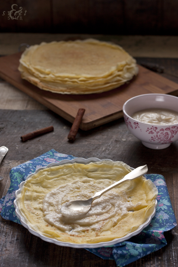 Las filloas os las traigo acompañadas de una crema de manzana y queso muy ligerita y absolutamente light, pero que le da el puntito salado-dulce que las hace distintas e irresitibles.