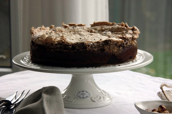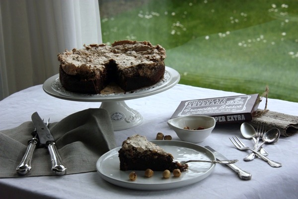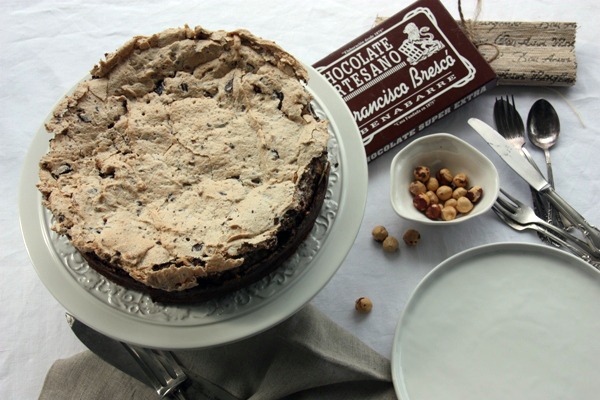 El pastel que os presento, no es un pastel cualquiera de chocolate, es un pastel con encanto, no solo por la presentación, que sirve para ocasiones especiales, sino por que el conjunto de ingredientes le aporta una mezcla exquisita de sabores y texturas.El sabor del chocolate, mezclado con un ligero toque de café, vainilla y ron. La mezcla de texturas, entre el chocolate cremoso y fundente por la mantequilla, con una ausencia total de harina, y el merengue vaporoso, en contraste con las avellanas crujientes, hacen que cada pedacito de pastel que te llevas a la boca sea una verdadera delicia, y no solo para los muy chocolateros
