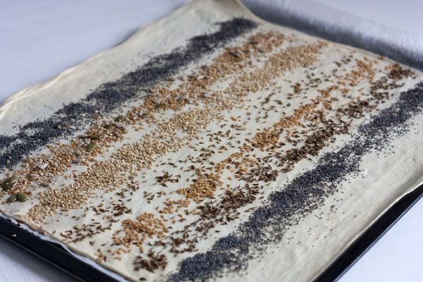 Rociamos la masa con agua y la cubrimos de semillas y especies, formando tiras.