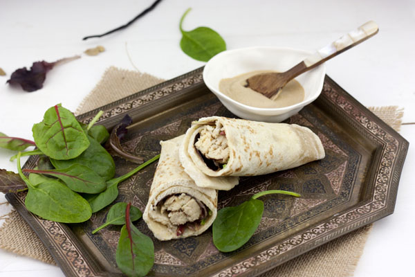Si queremos preparar enrollables, barnizamos el pan con salsa tahini, cubrimos la superficie con una buena porción de mezclum, y acomodamos sobre ella el pollo.