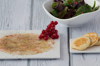 6.- Las cosas de Cósima (Elena, “Cósima para los amigos”): Carpacio de Gambón y Ensalada de Brotes con Frambuesas deshidratadas