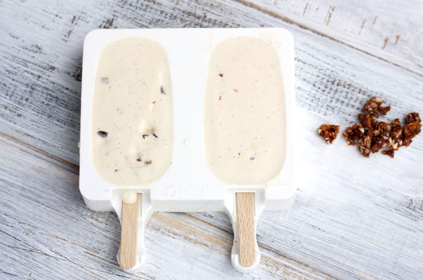 Vertemos en los moldes, colocamos el palo y raseamos a nivel con ayuda de una espátula o el dorso de un cuchillo, cubrimos con papel film y al congelador durante al menos 3-4 horas hasta la completa congelación. Cuanto mas tiempo mejor.