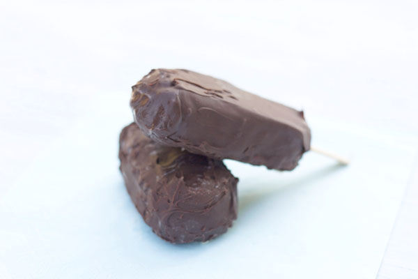 Rápidamente bañamos el helado de vainilla con el chocolate. Para que se termine de secar, conviene ponerlo un par de minutitos en un superficie que los mantenga verticales. Yo utilicé un corcho blanco, pero es un poco duro, mejor algo tipo esponja de floristería.