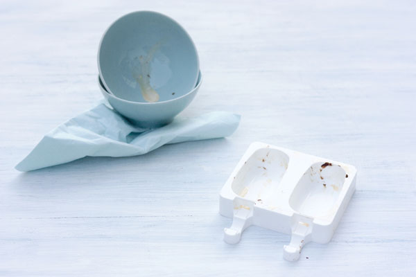 Y es que una vez haces el primero, el chocolate se pone mas frío, con lo que la cobertura queda mas mazacote y que pasa, pues que cuando lo das la vuelta para cubrirlo por el otro lado, pufff se cae la cobertura del lado que ya tenías cubierto, que por el peso no aguanta…. pero es que además la cobertura ya está dura y con la forma del helado……… y te pones de una mala leche del 20. Así que de nuevo con el helado al congelador para que se enfríe bien otra vez, a entibiar el chocolate y a volver a empezar…