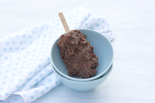 – No os llevéis a engaño, el baño de chocolate es de lo mas complicado, yo aun ando ensayando para mejorar la terminación, mira que he visto blogs que los han preparado, y o yo soy una torpe…..o ellos se han evitado contar los pormenores de la problemática de la cobertura. Eso si cuando he visto la receta habitualmente solo sacan la foto de 1 helado. El primero viene a salir el que mejor.