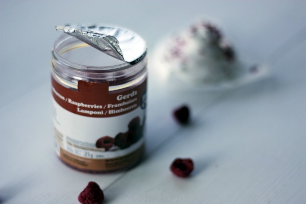 - Un puñado de frambuesas liofilizadas trituradas en el mortero.