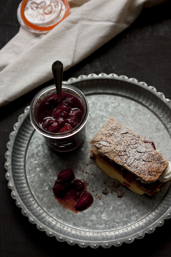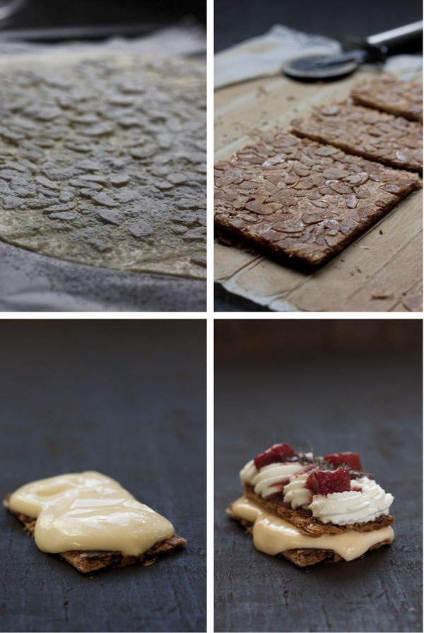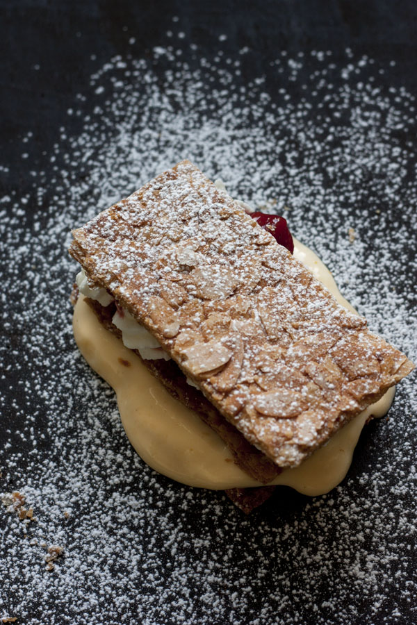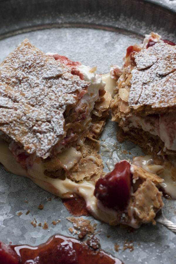 En cada mordisco, las hojas del hojaldre y las almendras se quiebran en mil pedazos y se mezclan con la crema suave y el chantilly cubierto con la compota de fresas balsámica aromatizada. Un placer adulto.