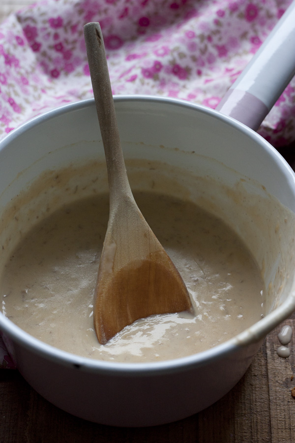 Vertemos toda la mezcla de nuevo en el cazo y a fuego medio, sin llegar a hervir (90ºC), y revolviendo continuamente dejamos que espese hasta que veamos que cubra el dorso de la cuchara.