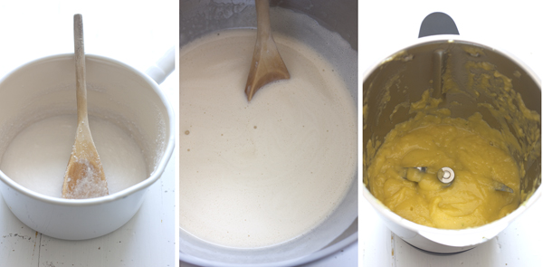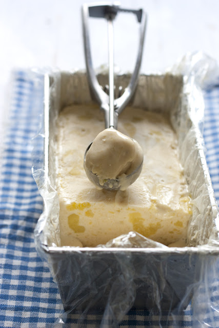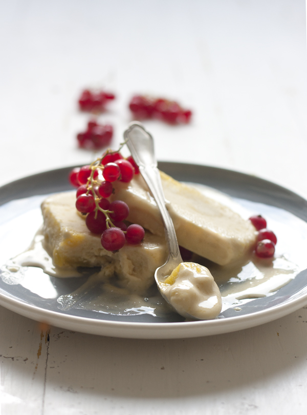 Vamos con la receta, que es de Jane-Anne Hobbs, que tiene un blog, que si no lo conoceis, no os no os lo podéis perder, “Scrumptious South Africa“, y en cocreto de su libro “Scrumptious”. Es muy sencilla, ya que se prepara una base de crema con leche de coco y yemas de huevo, se le añade el puré de mango y listo a enfriar.