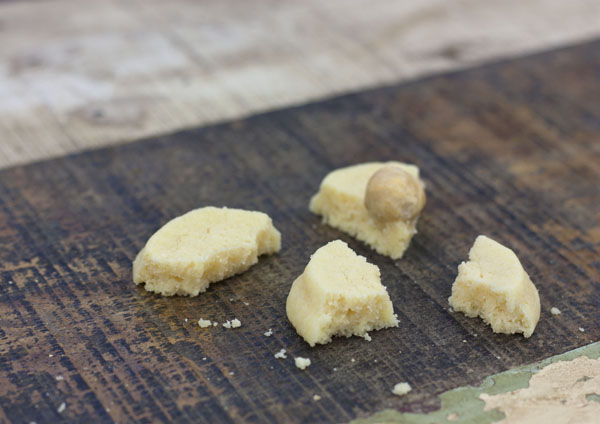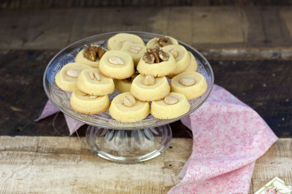 Colocamos sobre cada una de ellas un fruto seco, nuez, almendra, avellana, piñones… presionando ligeramente para que se adhiera. Podéis también barnizar la superficie con un poco de agua, y entonces pegar el fruto seco.
