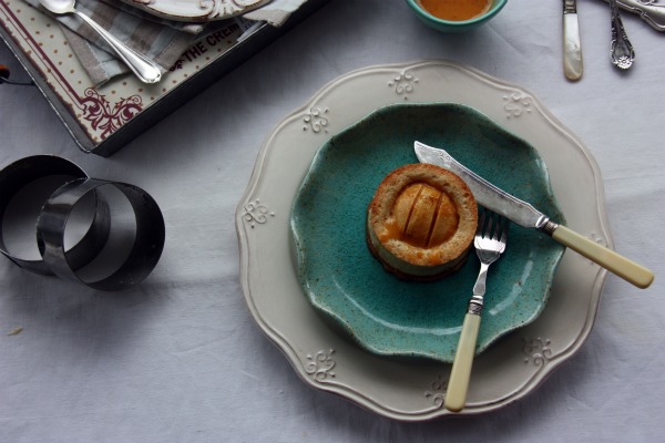 Pues no peneis, aquí rauda y veloz os presento la receta.Estan formados por una base de masa quebrada de avellanas y sobre ella una especie de pasta sable de avellanas que sustituiría al bizcocho tradicional, pero que es mucho mas delicado, y se funde en la boca a cada bocado. Esta pasta sable de avellanas, cuando se cuece en el horno, crece y envuelve la pieza de fruta, en este caso la manzana, como si de un tesoro escondido se tratara, así que nos deja una presentación muy especial.En cuanto a sabores, las avellanas le otorgan mucha personalidad. Y la mezcla de frutas, manzana entera y albaricoques en puré, le dan ese puntito, que rompe el dulzor de la masa. Si además lo acompañas de una bola de helado de vainilla……En fin una delicia.