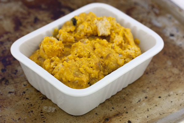 Troceamos el panettone en cuadraditos de 1,5 cm y los incorporamos a la mezcla. Removemos todo bien para que los cuadraditos queden bien cubiertos e impregnados de la mezcla de calabaza asada.