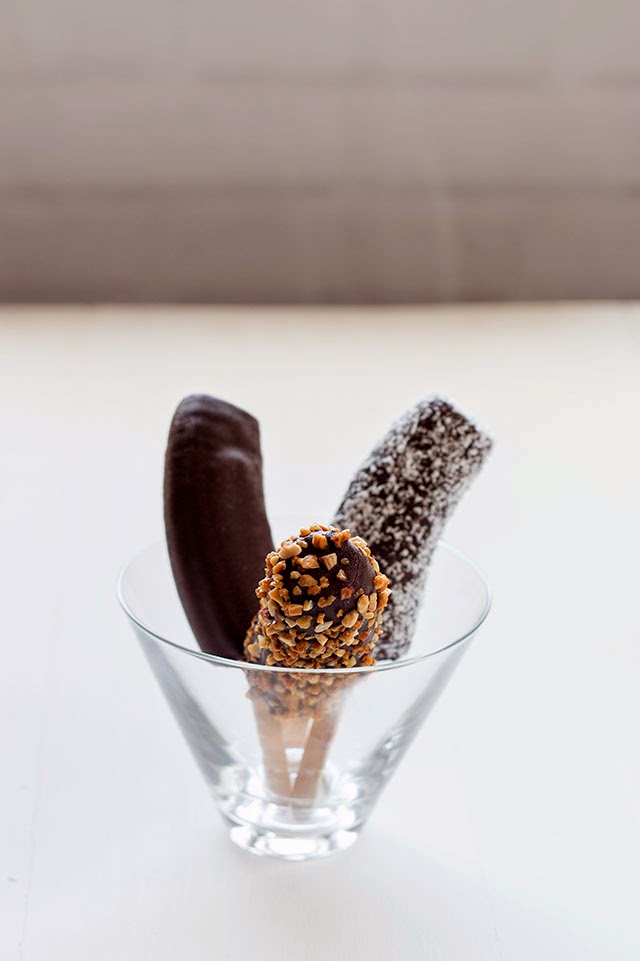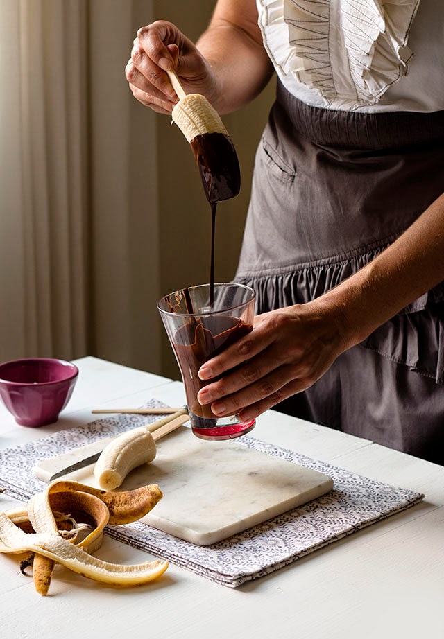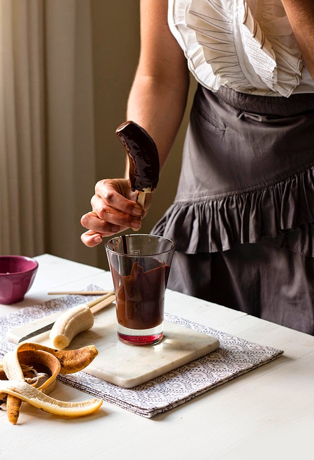 5.- Sacamos los plátanos del congelador y los vamos bañando de uno en uno en el chocolate derretido, dejando escurrir el exceso de chocolate. Veréis que solidifican enseguida debido a la baja temperatura del plátano.