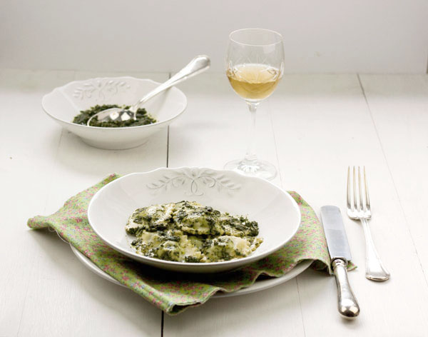Yo en mi caso he elegido unos Raviolis di magro o Raviolis sin carne, termino que se utiliza en Italia para describir generalmente, los raviolis rellenos de espinacas y ricotta. Estos Raviolis se sirven en Nochebuena, cuando no se debe comer pasta rellena de carne.