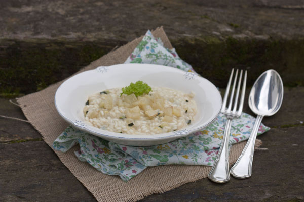 En este caso he preparado un risotto que podría denominarse clásico en la red, el risotto de pera y gorgonzola, al que me he permitido la licencia de añadirle un calabacín pequeño con su piel.El calabacín lo acompaña a las mil maravillas, ya que no tiene un sabor pronunciado, sino mas bien discreto, y sin embargo le da un puntito de color estupendo al no retirarle la piel.Las última ocasión que vi este risotto, y que en definitiva fue la que me recordó que aun lo tenía en mi carpeta de “pendientes”, fue en el Blog de Carlos “Mercado Calabajio“, como siempre os he dicho, un blog de referencia.