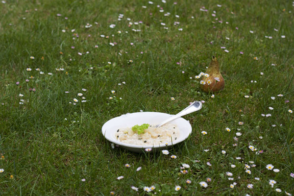 Servimos de inmediato, decorado el plato con las peras reservadas y espolvoreado con parmesano recién rallado.
