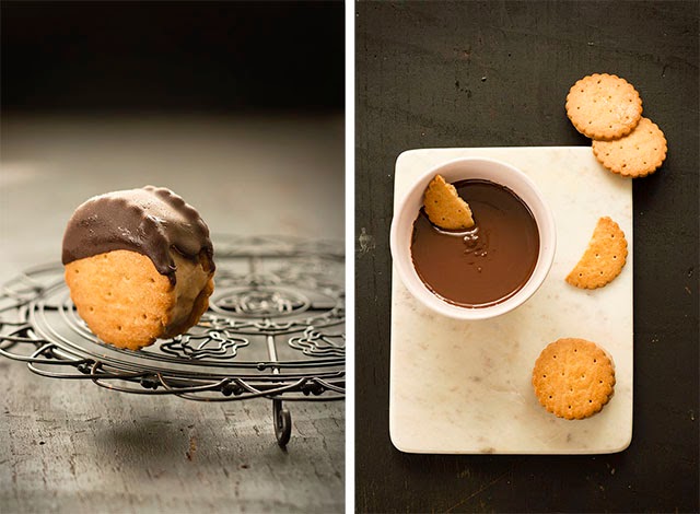 Sacamos los bocaditos del congelador y vamos bañando uno a uno en el chocolate, solo hasta la mitad de la galleta.