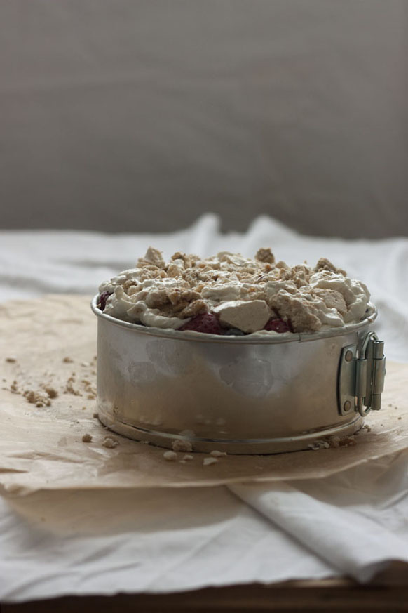 Cubrimos la base del molde con 1/3 de la mezcla de nata y merengue. Cubrimos con la mitad de los frutos rojos y depositamos otro 1/3 de nata y merengue, otra capa de frutos rojos y finalizamos con la mezcla restante de merengue y nata.