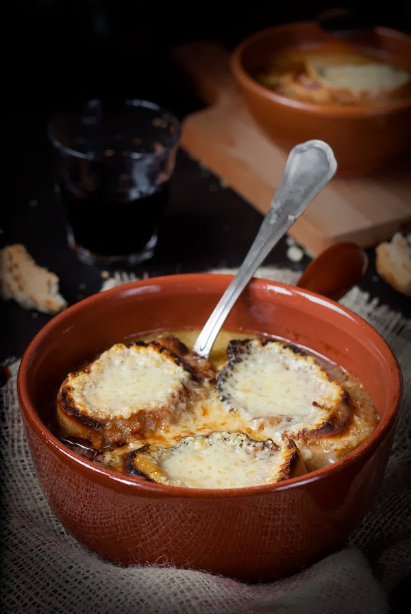Sopa sencilla, sobre la base de unas cebollas doradas ligera y lentamente en mantequilla (nunca aceite de oliva), un caldo de pollo y un buen queso sobre una rebanada gruesa de pan tostado. A gratinar y listo para disfrutar. Receta del maestro francés Joel Robuchon.