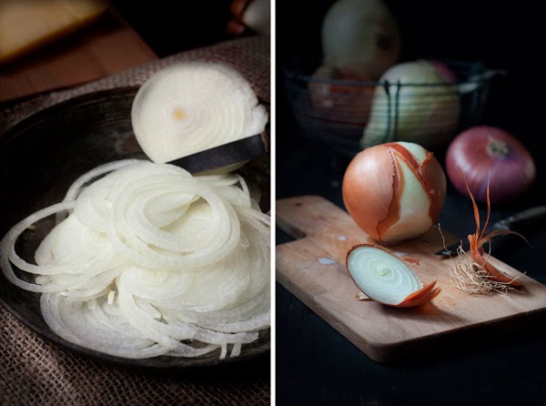Hay una foto que me ha encantado, la de la cebolla cortada en láminas sobre un plato metálico, con el cesto de cebollas al fondo ♥