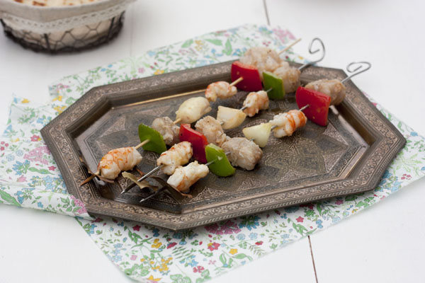 A la hora de ensartarlo dejad un poco de espacio entre ingrediente e ingrediente, ya que de lo contrario costaría mucho que se hiciese el pescado o la verdura en la zona que está inmediatamente pegando a el otro ingrediente.